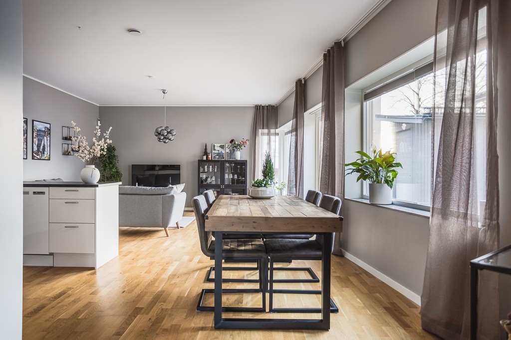 Kök och vardagsrum i öppen planlösning med stora fina fönsterpartier och utgång till uteplatsen.