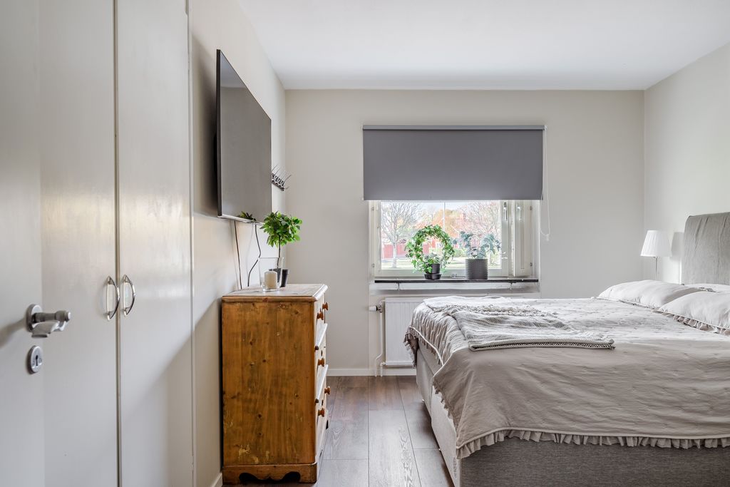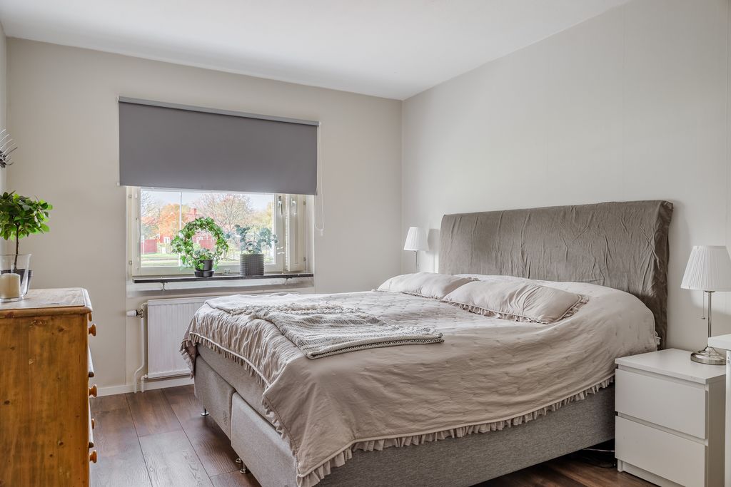 Rymligt sovrum med nytt laminatgolv och nymålade väggar. Här finns 2 garderober.