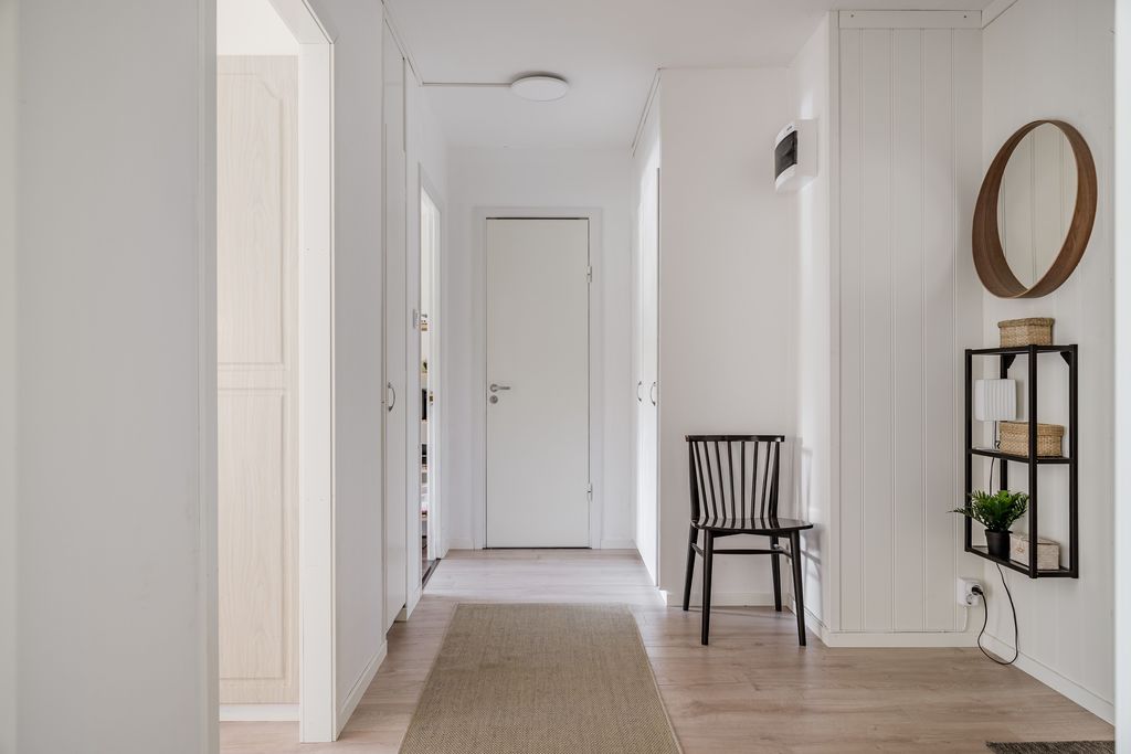 Välkomnande hall med nytt laminatgolv och nymålade vita väggar. I hallen finns 3 garderober.