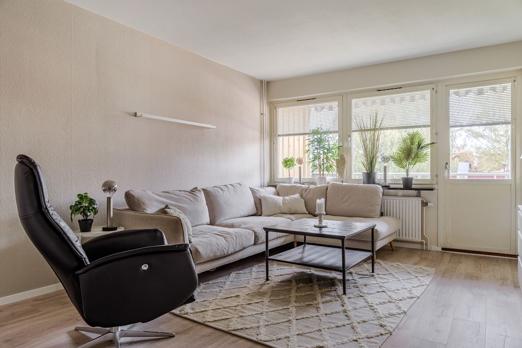 Rymligt vardagsrum med nytt laminatgolv och nymålade väggar. Härifrån kommer man ut på den soliga balkongen.