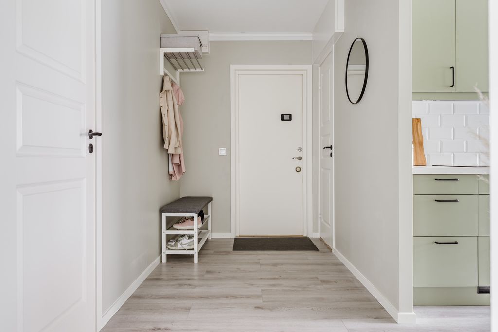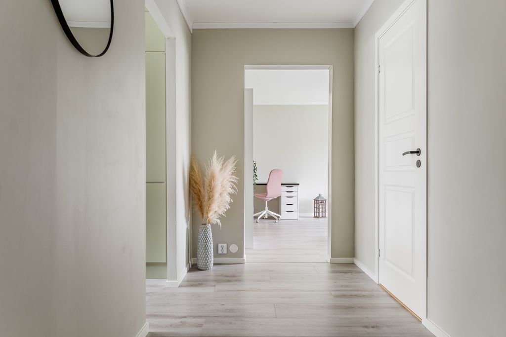 Hall med laminatgolv som är genomgående i alla torrutrymmen.