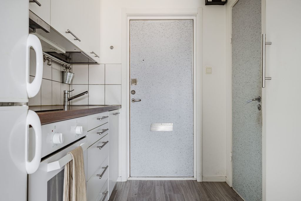 Hall kombinerat med kök har laminatgolv och vita väggar. I köket finns spishäll, ugn, fläkt, och kyl/frys.