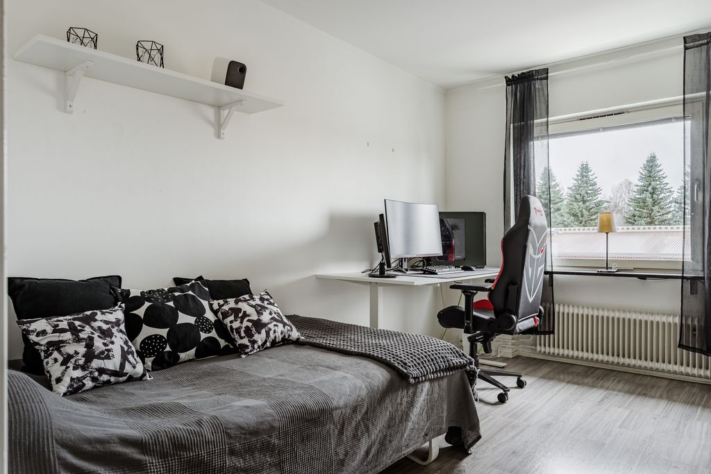Rum med laminatgolv och vita väggar. Här finns garderober.
