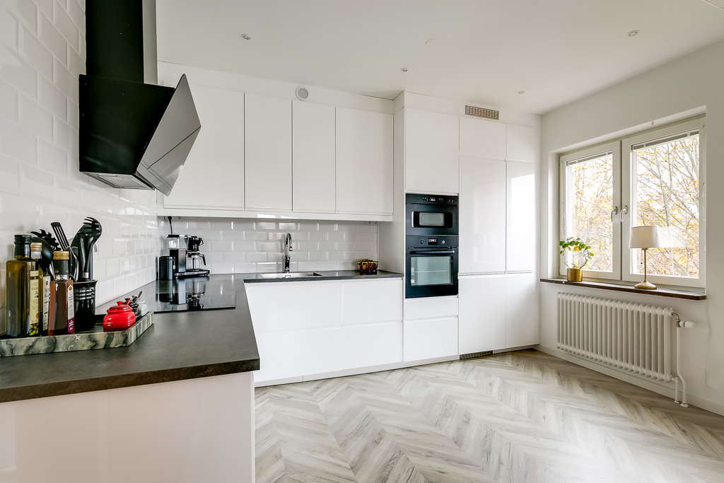 Vita skåpsluckor med vitt kakel över arbetsytorna. Renoverat under 2020. Utrustat med inbyggd ugn och mikro, diskho, köksfläkt, spishäll och diskmaskin. Spotlights i taket. Vita väggar och laminatgolv.