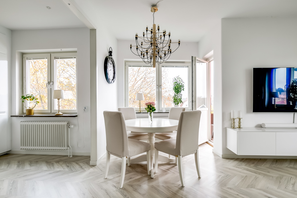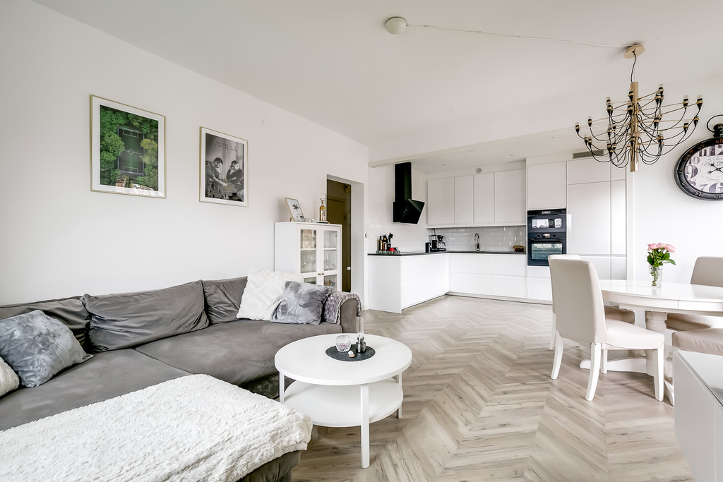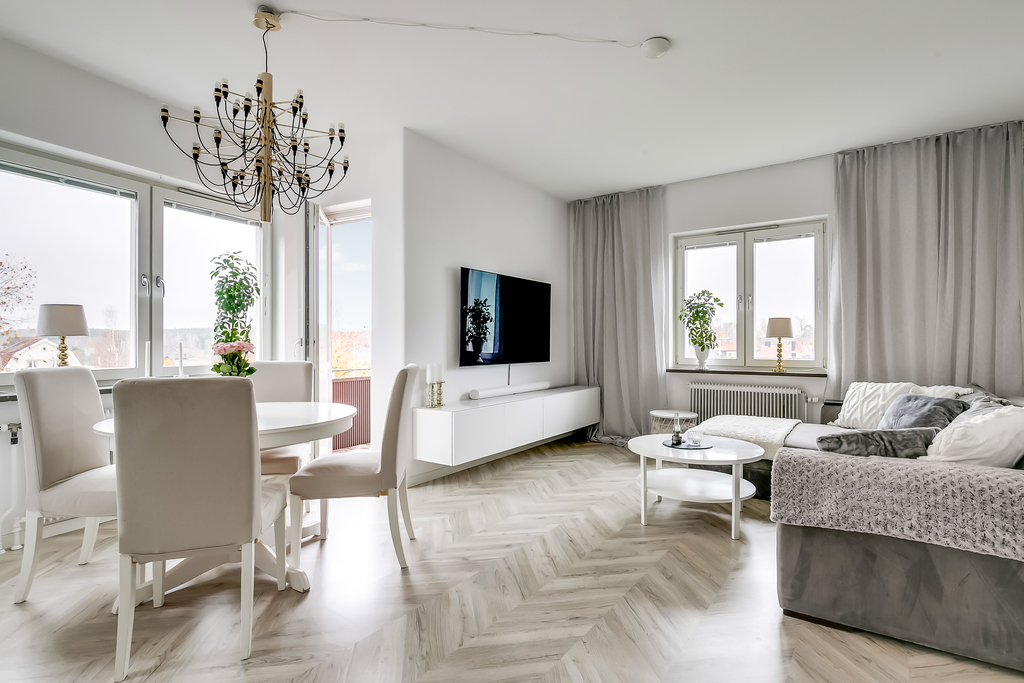 Gediget rum med öppen planlösning mot köket. Här finns plats för såväl större soffgrupp som matbord. Vita väggar och laminatgolv.