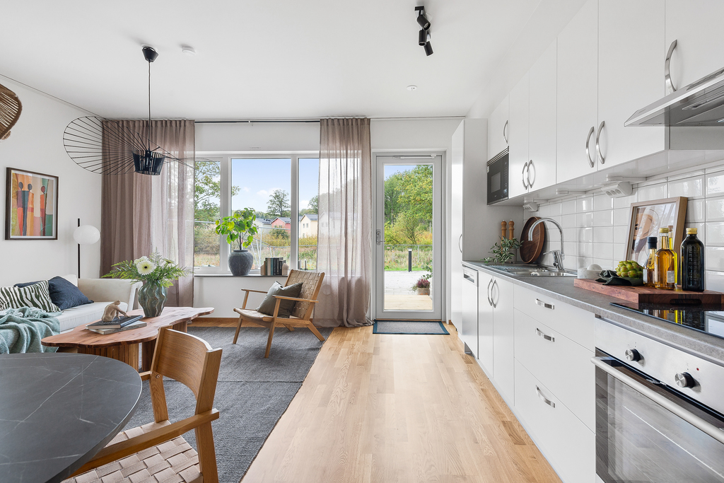 Ljust och inbjudande vardagsrum med stora fönsterpartier och generös takhöjd om 2,7 meter som ger en ytterligare förhöjd känsla av extra rymd. Öppen planlösning mot köket ger sociala ytor att möblera fritt med både soffgrupp och matplats i nära anslutning till varandra. Neutral färgsättning på såväl väggar som snickerier samt genomgående parkettgolv som skapar en naturlig helhet till bostaden. Från vardagsrummet har ni via glasdörr utgång till den egna uteplatsen.