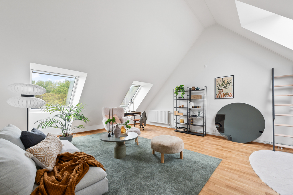Ett praktfullt våningsplan med öppen planlösning och svårslagen takhöjd med hela 3,85 meter upp till nock. Här får ni ett flödande ljusinsläpp via tre fönsterpartier i två väderstreck och omättade möjligheter att skapa ytor efter familjens egna önskemål. Detta våningsplan är perfekt att nyttja som ett mysigt tv-rum under familjens alla fredagskvällar, eller varför inte på ett enkelt sätt bygga till ett par ytterligare sovrum för den som önskar. Samma genomgående materialval genom hela bostaden i form av ljusmålade väggar och gediget ekparkettgolv.