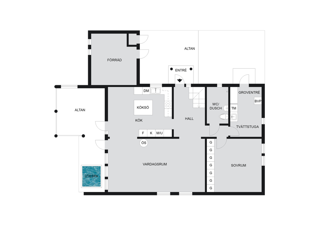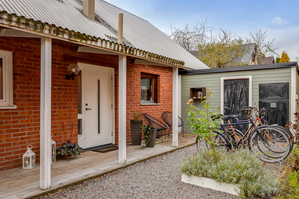 Entréplanet, renoverat 2019 i moderna grå toner, erbjuder en öppen planlösning mellan vardagsrum och det generösa köket med köksö. Här finns en trivsam samvaroyta med öppen spis, stort sovrum, helkaklat duschrum samt tvättstuga med egen ingång. Från både vardagsrum och kök nås altanen som delvis ligger under tak – perfekt för sommarkvällar med middagar och bad i det härliga utespat.