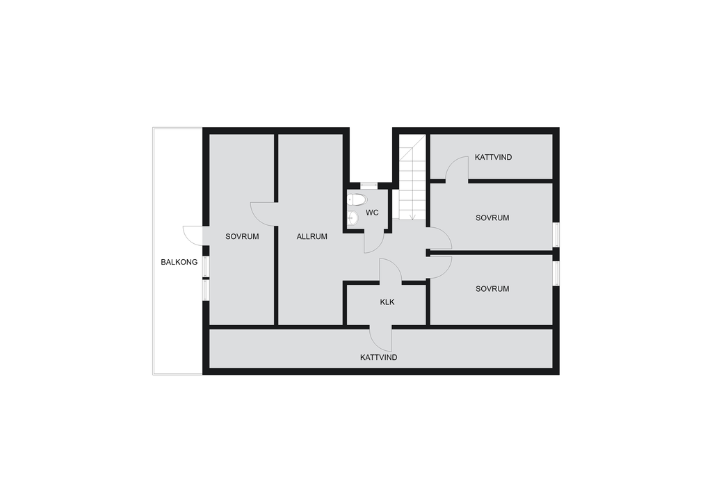 Övre plan rymmer en möblerbar hall, tre sovrum i varierande storlek samt duschrum. Det största sovrummet har utgång till balkong med kvällssol.