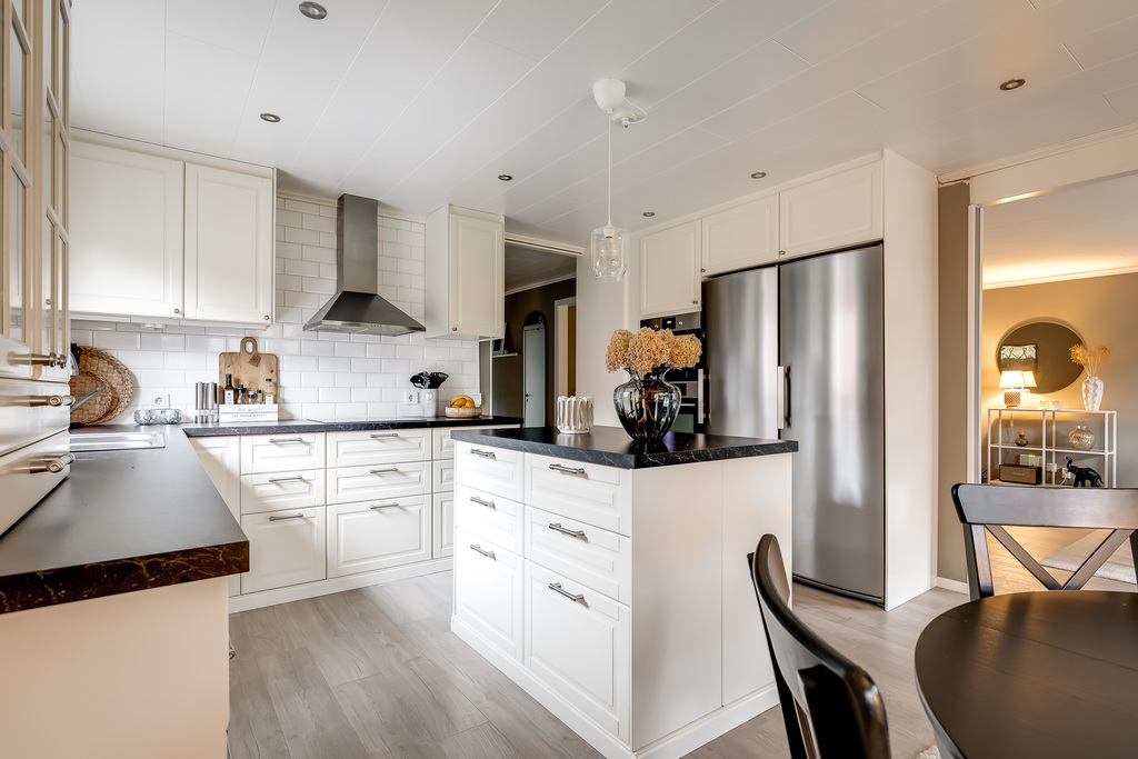 Modernt IKEA kök från 2016 med vita köksluckor och svart bänkskiva. Härifrån nås även altanen som delvis är under tak och ett härligt Spabad från 2017. Maskinell utrustning är kyl och frys, diskmaskin, inbyggnads ugn och mikro, spishäll och fläkt.