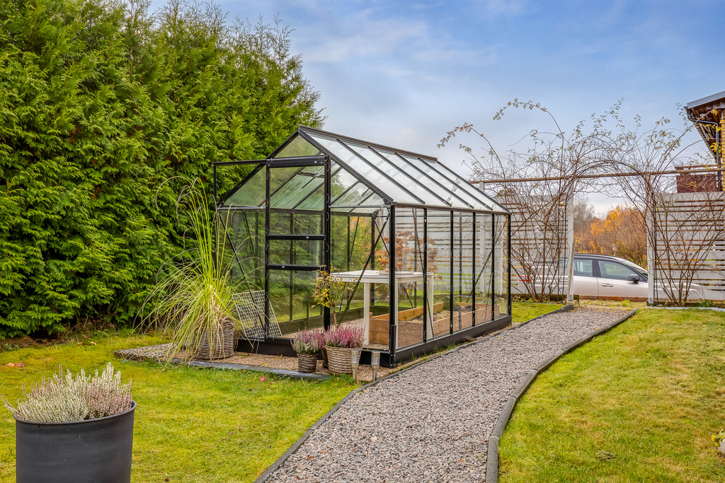 Till fastigheten hör garageplats samt parkeringsplats med laddstolpe. Här finns även större förråd, växthus och fiber indraget i huset.