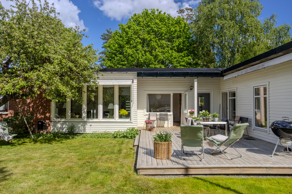 Den insynsskyddade trädgården med både terrass och plan gräsmatta ramas in av huset i vinkel och skapar en trivsam plats för avkoppling, lek och umgänge.