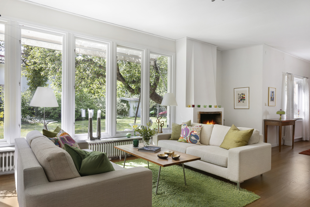I den andra delen av vardagsrummet ligger bostadens bibliotek, avskilt med spröjsade glasdörrar. Härifrån når man trädgårdens stora terrass – perfekt för umgänge under sommarhalvåret.