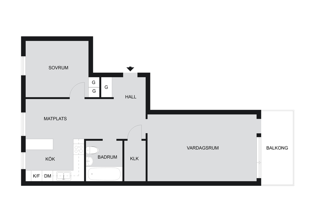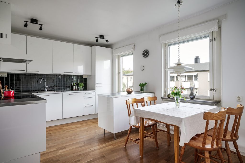 Stilrent och ljust kök med fönster mot morgon- och förmiddagssolen. Vitt/svart kakel, ljusgrå arbetsbänk, infällda spotlights, induktionshäll, fläkt, ugn, diskmaskin och kyl/frys. Praktisk köksö ger extra arbetsyta som avskiljer mot matplatsen. Ekparkettgolv i hela köket. Gott om plats för matbord vid fönster. För den som vill så kan man dela av köket och få ett mindre sovrum/barnrum där matplatsen är idag.