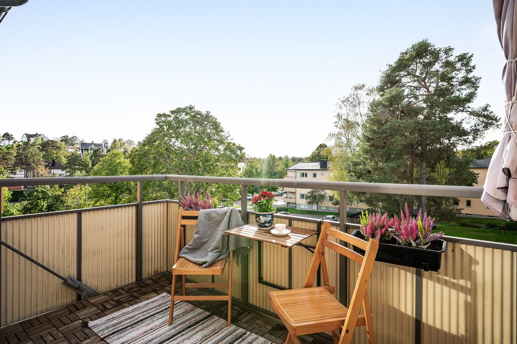 Från vardagsrummet nås den insynsskyddade balkongen med flödande eftermiddags- och kvällssol. Plats för bord och stolar. Vidsträckt vy över omgivningen. Nedanför balkongen finns föreningens trevliga trädgård med stora grönytor, lekplats och sittgrupper.