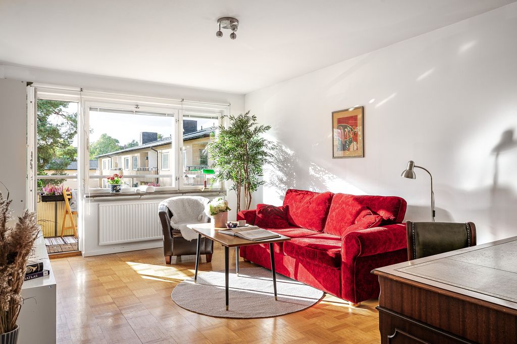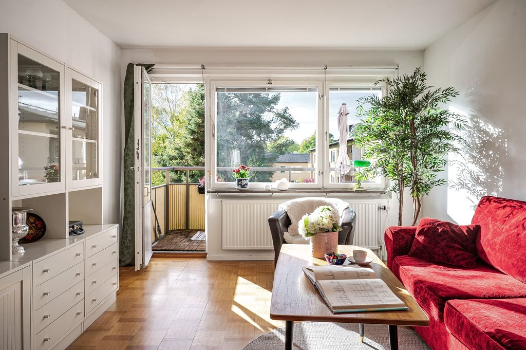 Härligt ljust och stort vardagsrum med klassiskt rutmönstrad ekparkett och stort fönsterparti i sydväst. Gott om plats för både soffgrupp och matplats. Utgång till balkong i syd- och västlig riktning.