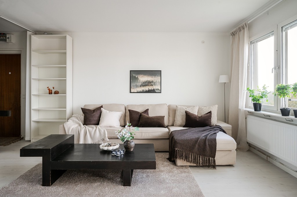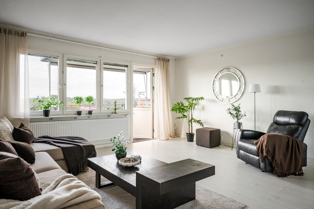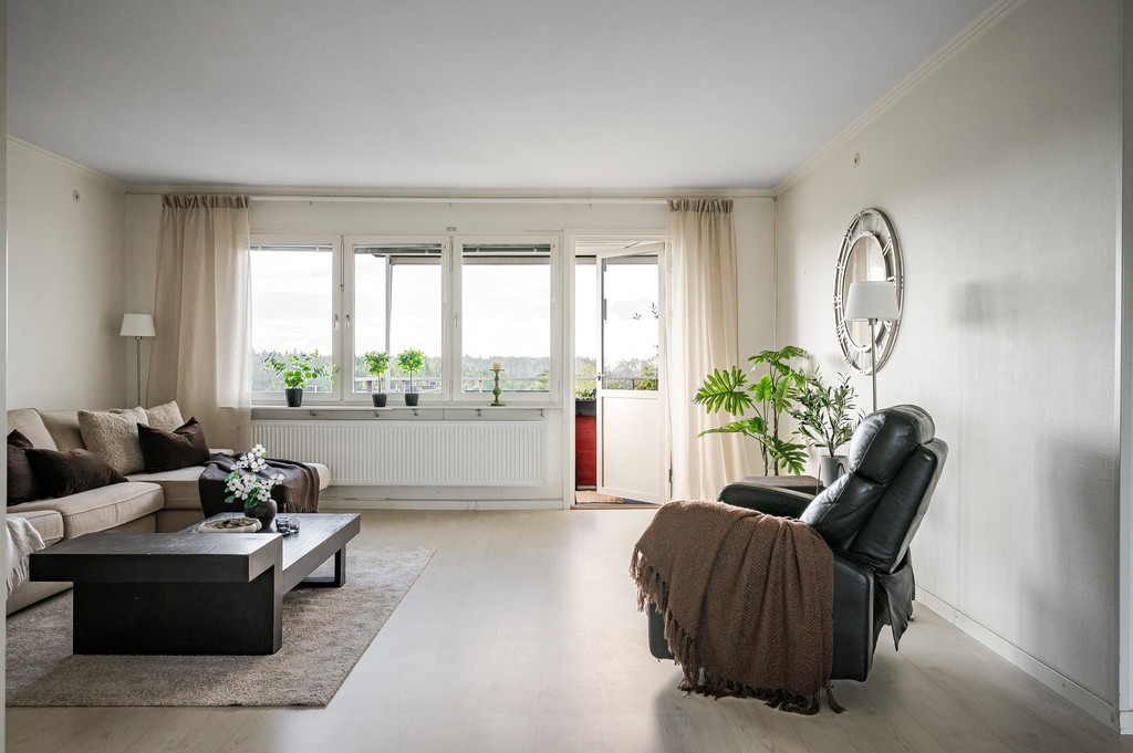 VARDAGSRUM: ljust och luftigt rum och i öppen planlösning mot köket. Utgång till balkongen rakt i söder med fri sikt. Ljusa målade väggar och vitlasert laminatgolv.