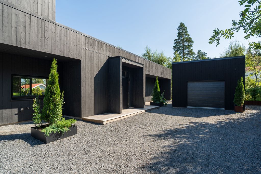 Tomten omgärdas av en tät och välvårdad häck som skapar en skyddad och privat atmosfär fri från insyn. Den generösa uppfarten erbjuder gott om plats för bilar och på tomten finns ett fristående garage om ca 30 kvm. Garaget har gjuten platta med indraget vatten och avlopp samt förberett för fjärrstyrd port. Garaget är delvis isolerat. Dessutom finns även ett separat, isolerat förråd som ger extra förvaring utan att kompromissa med tomtens rena linjer.