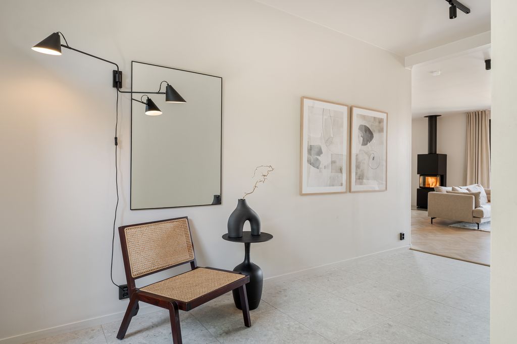 Välkommen till en villa där varje detalj är noggrant genomtänkt och där klassiska material möter modern funktion på ett sömlöst sätt. Redan i hallen möts du av en praktisk klinker som övergår i elegant fiskbensparkett, vilket löper genom hela huset och skapar en varm, enhetlig känsla. Förvaringslösningarna i den inre hallen är både generösa och diskreta och intill ligger ett helkaklat badrum i mycket hög klass. Vägghängd wc, tvättställsmöbel och dusch med alla detaljer i svart.