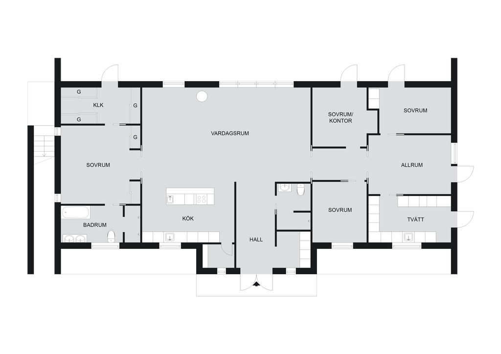 På husets andra sida ligger en mer avskild del med två sovrum, ett ljust allrum och ett stilrent kontor med glasdörrar – perfekt för arbete i hemmet eller som lugn läshörna. Utrymmet kan även användas som ytterligare sovrum. Här finns också ett praktiskt tvättrum som även rymmer teknik och har egen ingång. Allt är genomarbetat för att skapa ett hem där funktion och estetik går hand i hand, med en röd tråd av kvalitetskänsla i varje kvadratmeter.