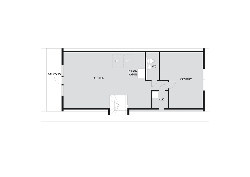 Ovan trappan möts vi av ett rymligt och trivsamt allrum med patinerat trägolv och snedtak som ger rummet en ombonad känsla. Här finns en mysig braskamin som sprider värme och trivsel under årets kallare månader. Två takfönster ger ett fantastiskt ljusinsläpp och en utgång leder till en balkong under tak – en perfekt plats att njuta av kvällssolen.