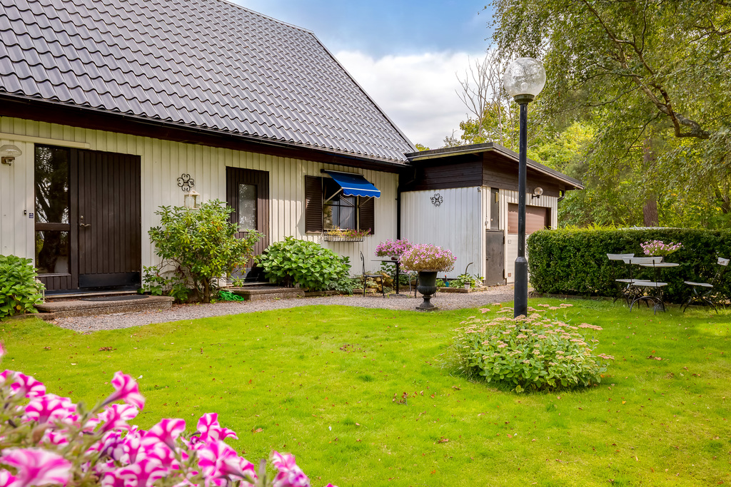 Vidbyggt huvudbyggnaden finns ett varmgarage för en bil med egen luft/luft-värmepump vilket gör det användbart för pyssel och hobbyarbeten året om. Trädgården är plan och lättskött med huvudsakligen perenna växter.