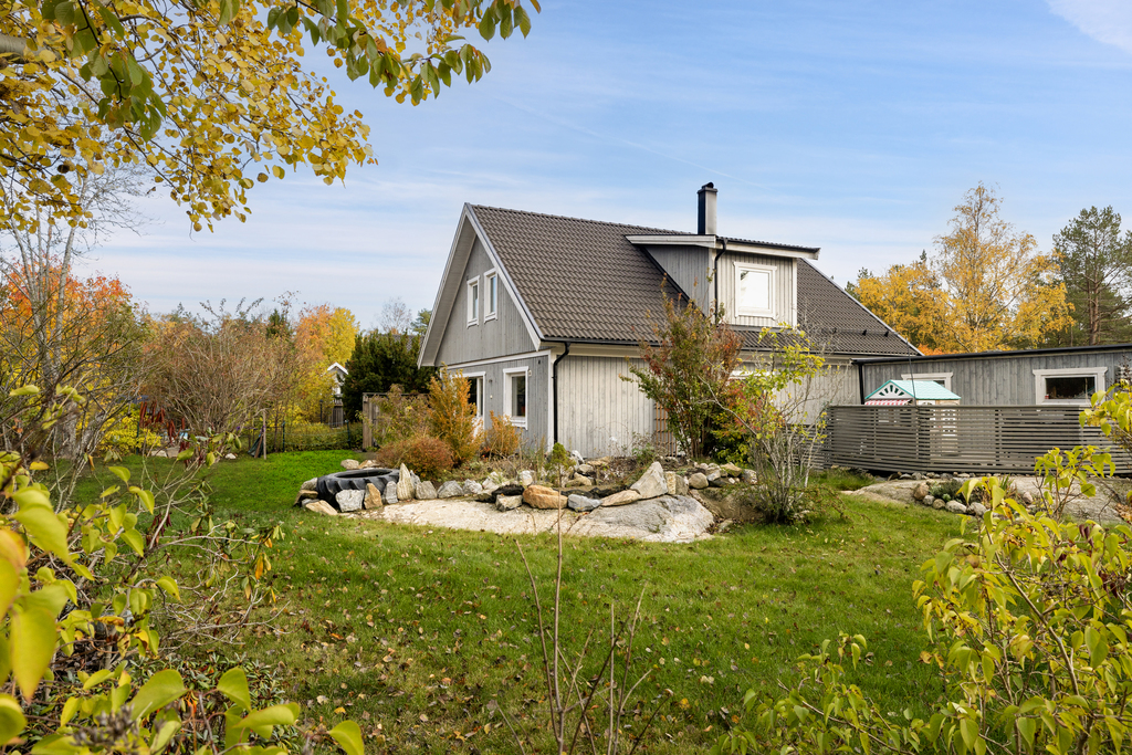 Friköpt hörntomt med en vacker utomhusmiljö och bästa solläge. Här finns öppen plan gräsyta och prunkande växtligheter som ramar in trädgården i sektioner för olika ändamål. Runt fastigheten finns en anlagd trätrall som sträcker sig utmed huset med flertalet uteplatser, på framsidan kan ni under tak inta frukosten i den härliga morgonsolen medan ni på sidan av huset kan duka upp får långa härliga måltider ute under bar himmel. Här har ni även vackra planteringar, grönskande buskar samt stora gräsytor för aktiva barnlekar. På tomten finns ett garage med separat förrådsdel samt uppfart som rymmer ytterligare bilar. Staket och grönskande buskage avskärmar tomten mot övriga grannar.