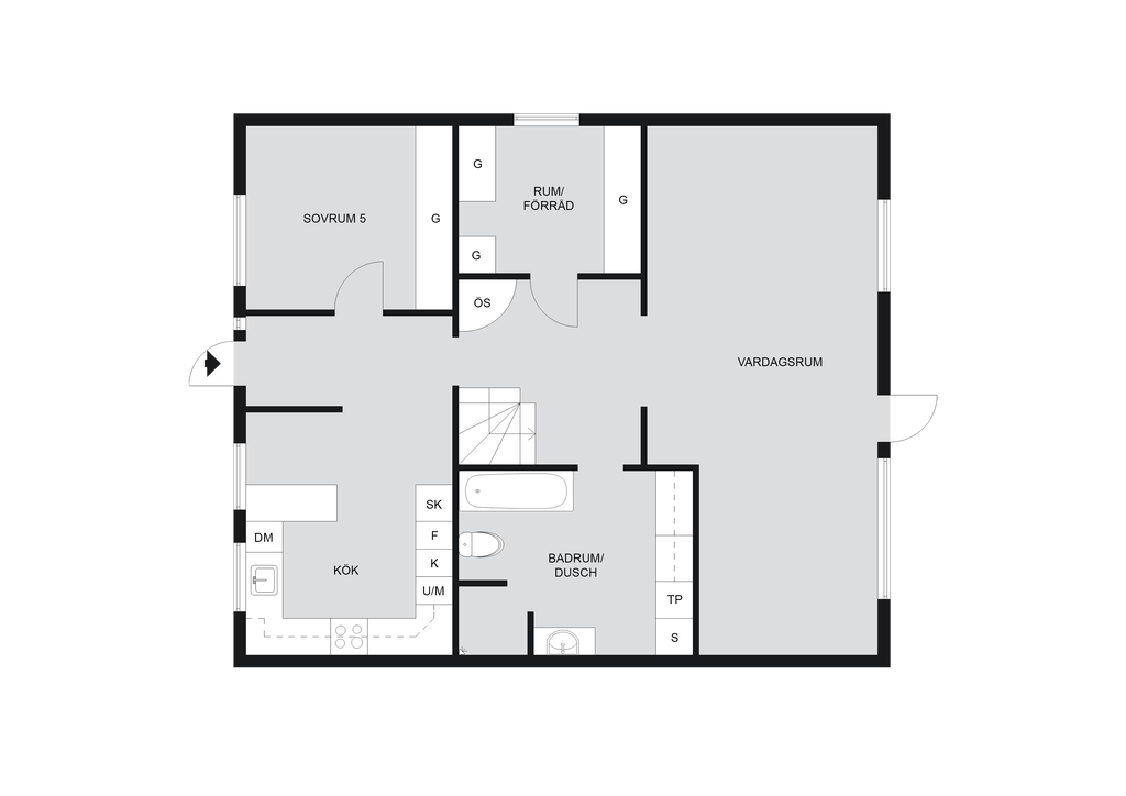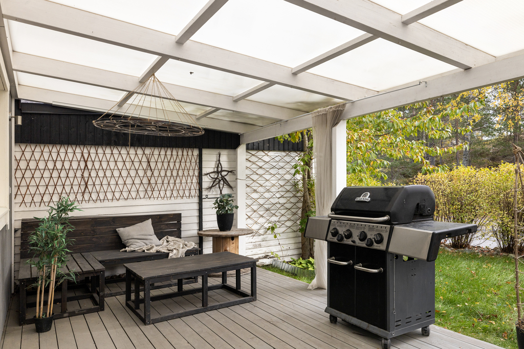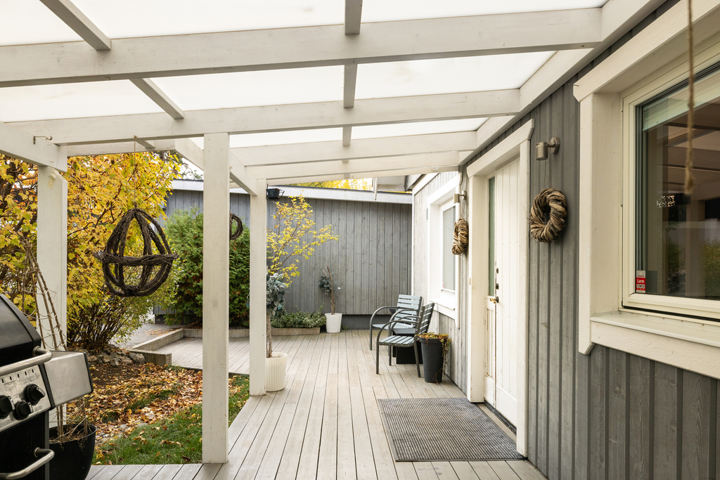 Här får ni ett behagligt dagsljusinsläpp via stora fönsterpartier med utsikt mot en utav uteplatserna placerade under tak – praktiskt belägen i nära anslutning till köket vilket möjliggör för många härliga måltider ute under säsongens alla väderomslag. Slitstarkt klinkergolv med behaglig golvvärme samt infällda spotlights i tak.