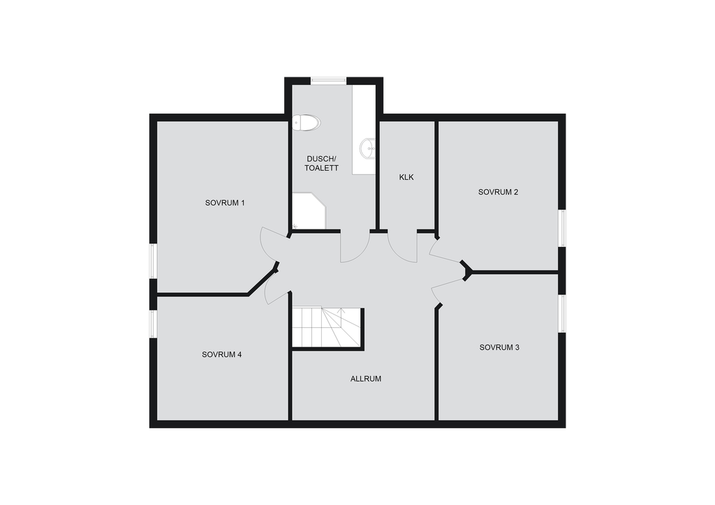 Allrum belägen på övre plan med yta att inreda fritt efter familjens egna preferenser. Här rymmer idag en soffa och möblemang som blir ett utmärkt tillhåll för familjens yngre små medlemmar. Ljusa målade väggar samt genomgående parkettgolv likt övriga våningsplanet. I anslutning till allrummet finns ett dolt förrådsutrymme med hyllor för praktisk förvaring.