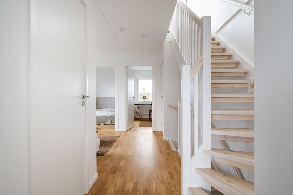 Rymligt allrum med rikligt ljusinsläpp via stort fönsterparti. Dolt förvaringsutrymme i klädkammare samt plats att inreda med socialt möblemang. Vita väggar och fint genomgående ekparkett på golv.