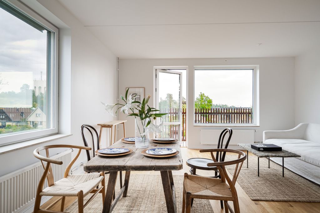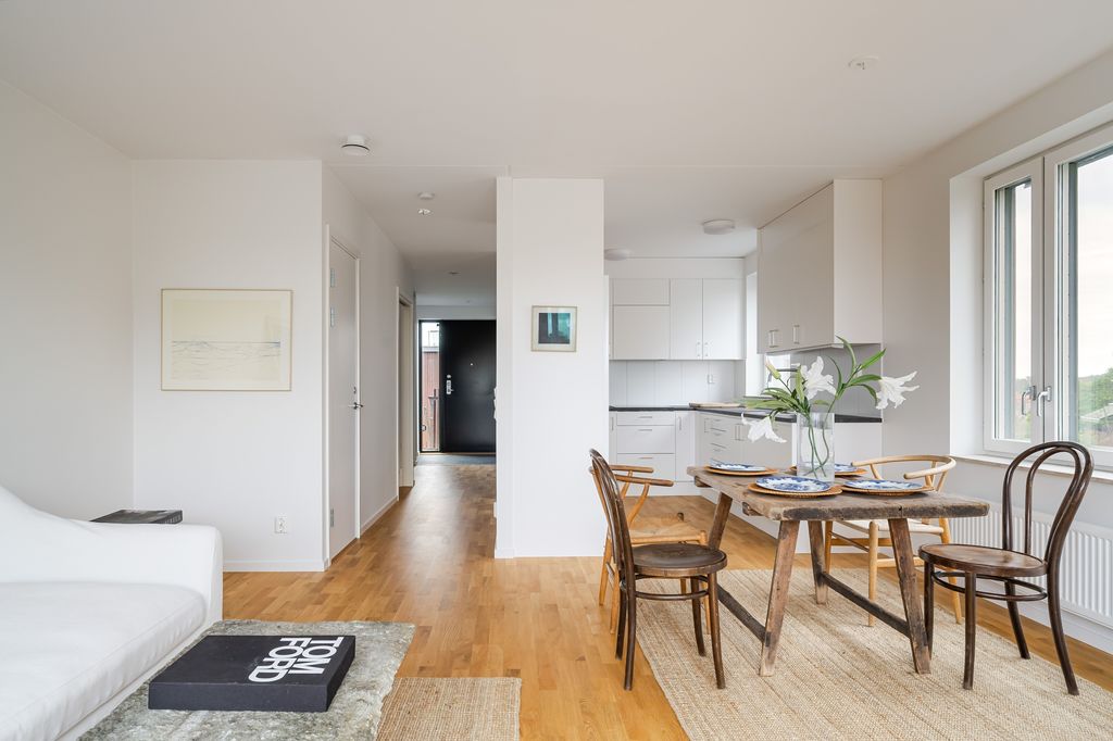 Ljust och inbjudande vardagsrum i hörnläge med stora fönsterpartier i två separata väderstreck. Öppen planlösning mot köket ger sociala ytor att möblera med både soffgrupp och matplats. Högt läge med vacker fri utsikt ut över havet och omgivningarna. Från vardagsrummet har ni via glasdörr även utgång till balkongen.