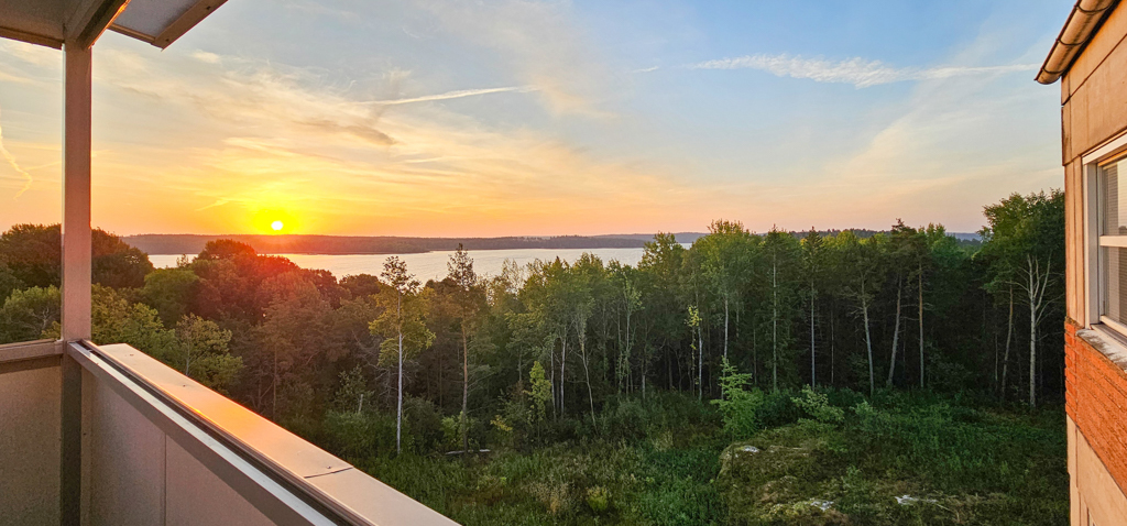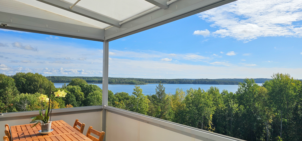 Rymlig inglasad balkong med fri utsikt över stora Värtan. Balkongen förlänger säsongen och erbjuder en härlig plats för avkoppling, middag eller att njuta av sol och vattenutsikt i alla väder.