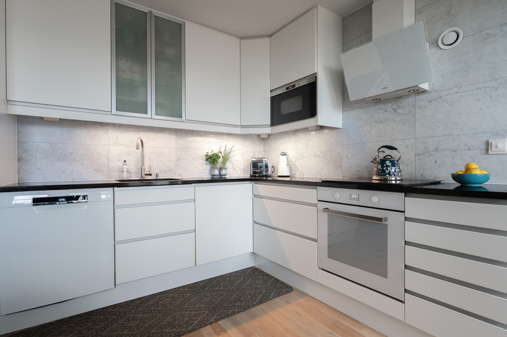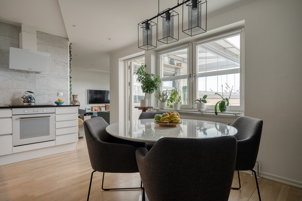 Stilrent och välplanerat kök med vita luckor och exklusiva detaljer i svart marmor som ger en modern och elegant känsla. Här finns fullstor kyl och frys från Samsung, induktionshäll, inbyggd mikro, ugn, diskmaskin, kolfilterfläkt samt en generös vinkyl. Rymlig matplats med fönstret med vacker havsutsikt över Värtan. Härifrån nås även den inglasade balkongen som förlänger säsongen och erbjuder en härlig plats för avkoppling.