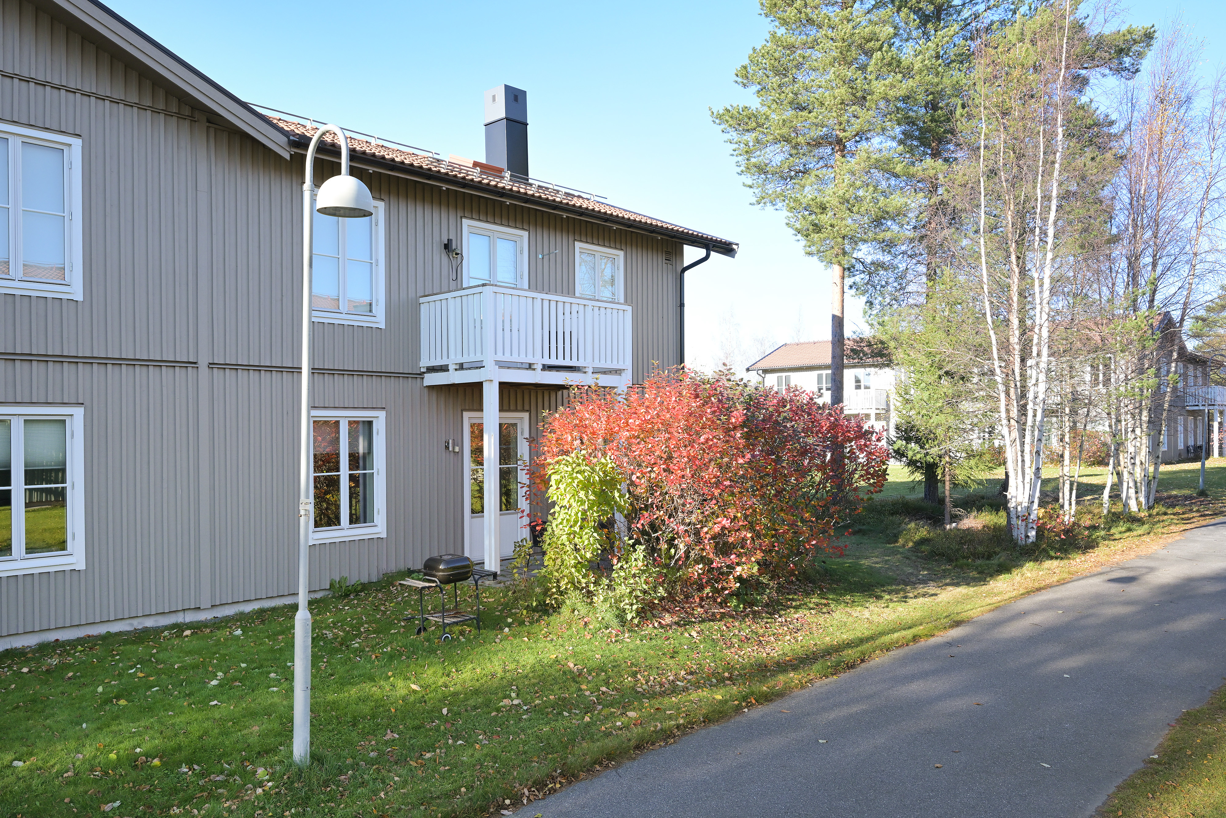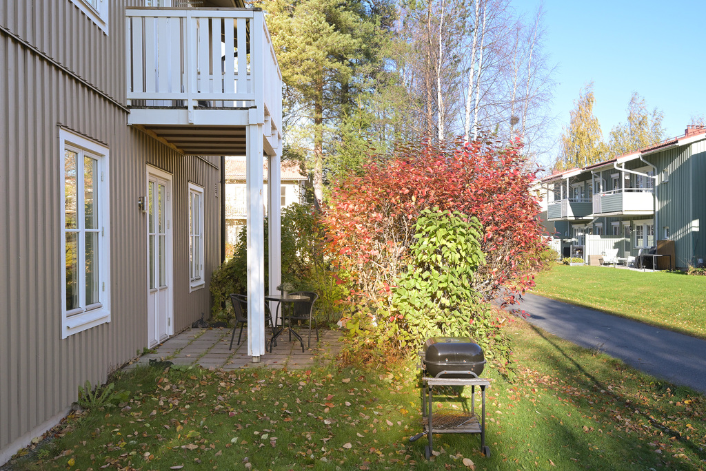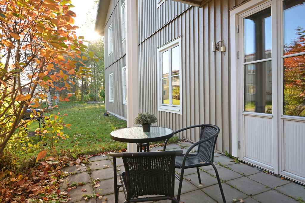 Lägenheten är smart planerad med sociala ytor och ett generöst ljusinsläpp som skapar en ljus och luftig känsla. Den privata uteplatsen bjuder in till härliga kaffestunder i solen, och den egna ingången ger extra integritet och en känsla av eget hus.