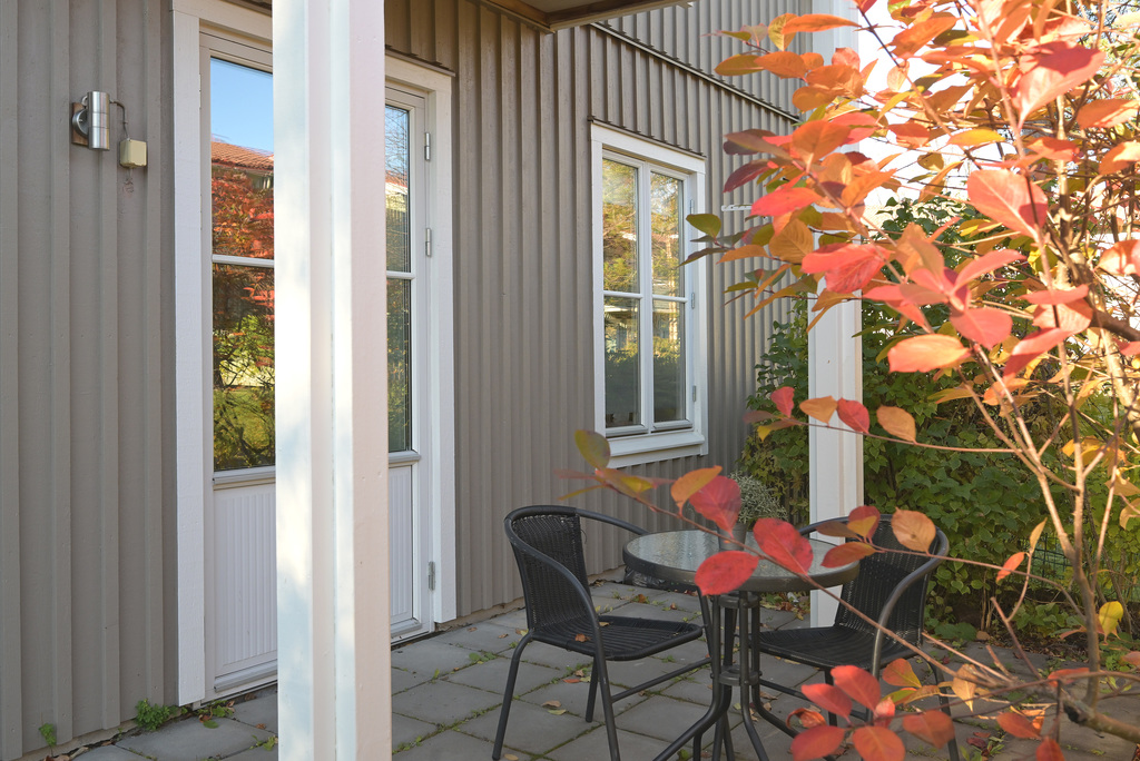 Öppen planlösning mellan vardagsrum och kök. Rejält med ljusinsläpp från fönster i 2 väderstreck. Utgång till mysig och avskild uteplats.